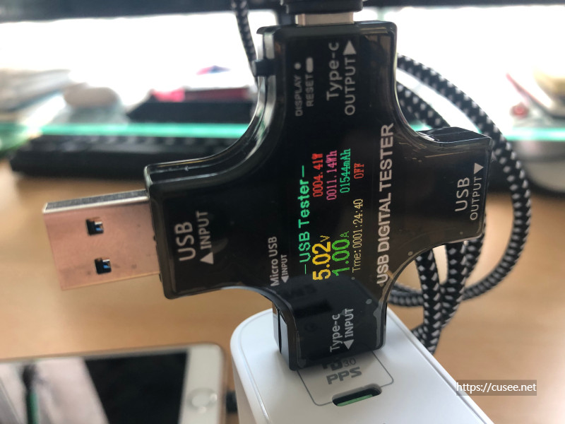 20V, 2A로 충전되므로 고속충전기 지원이 가능할 것으로 보여 PD 충전이 가능할 거 같았는데, 역시나 지원된다. USB테스터로 연결해 보니 20V, 2A로 충전이 이뤄진다! 뭔가 뿌듯한 기분이 들었고, 이 이유로 충전구 구매 폭주가 시작되었다는...