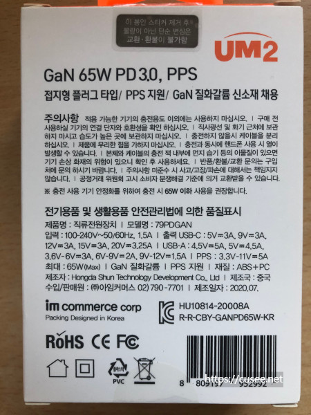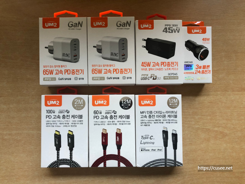 그래서 고른 제품이 아이엠커머스의 UM2 65W 3 포트 GaN 접지형 충전기였다. 오프라인에서 실물을 본 적은 없으나 각종 구매후기와 디자인을 보고는 그냥 구입했다. 충전기와 함께 케이블도 중요하다는 것을 알기에 같은 회사의 C to Lightning, C to C 케이블도 함께 구매했다. 일단 가격은 평소에 알던 충전기와 케이블 가격 이상이다. 그래도 Apple의 Lightning 케이블 정품 가격에 비하면...