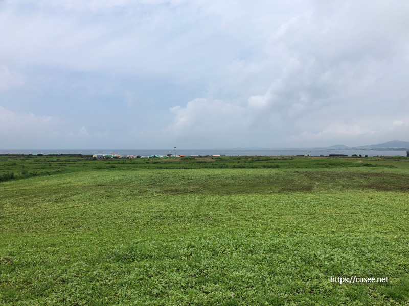 북쪽으로 보면 상동포구와 마을이 보이고, 저 멀리 송악산, 산방산, 모슬봉이 보인다. 날이 좋았으면 한라산도 보였을 것이다. 또한 봄이었으면 푸른색으로 넘실거리는 청보리 파도를 볼 수 있을 것이다. 남쪽으로는 송악산 거리만큼 마라도가 보이고, 그 앞으로는 큰 풍력발전기가 보인다. 이쪽도 청보리밭이 넓게 펼쳐져 있다.