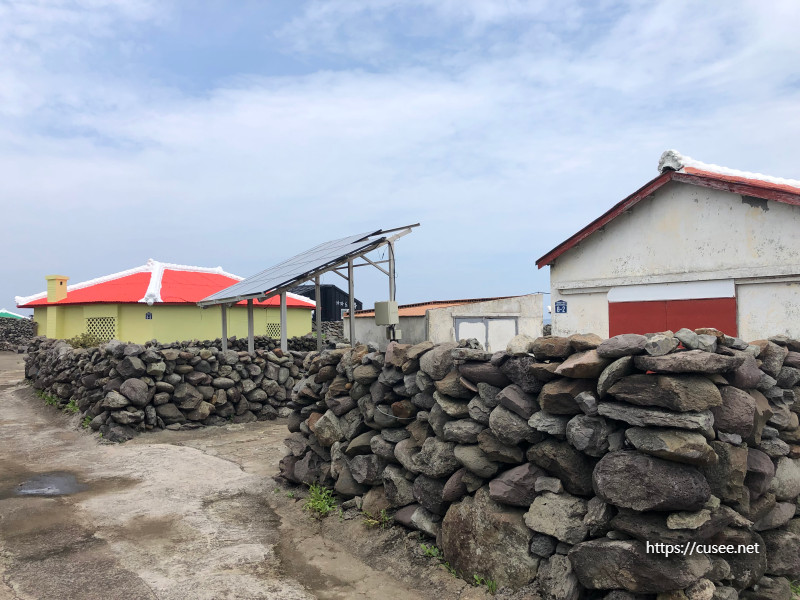 가파도는 2012년 9월 '탄소제로섬'으로 거듭나면서 태양광, 풍력으로 전기를 생산하는 친환경섬이 되었다. 마을 곳곳에는 태양광발전시설이 갖춰져 있는데, 장마철에는 가동률이 떨어져서 섬 중앙에 있는 발전설비에서 디젤로 발전을 한다. 우리가 방문한 이날도 풍력발전기는 멈춰 있었고, 섬 중앙의 발전소에서 발전을 하는 것 같았다. 덕분에 조용하던 섬마을은 발전기 소리로 요란했다. 섬에서 돌아다니는 작은 승용차들은 모두 전기차였다.