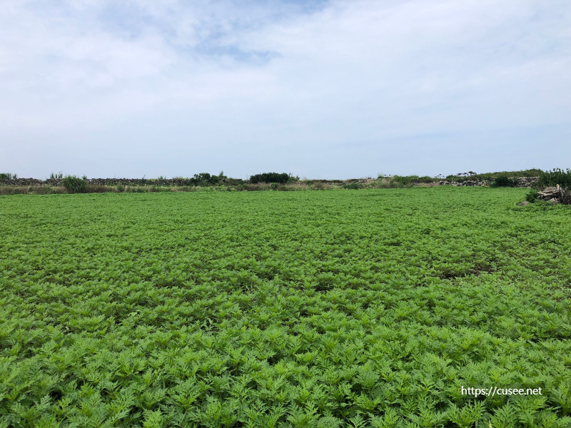 가파도는 청보리가 유명한데, 3월에서 5월에 볼 수 있고, 지금은 휴경을 하거나 다른 작물들이 재배되고 있다. 이곳이 청보리밭이었는지는 몰라도 당근이 자라고 있었는데, 온통 푸른색의 물결이 사람의 마음을 편하게 만든다. 그냥 걷다가 돌담에 잠시 앉아서 쉬어도 좋을 그런 풍경이 펼쳐진다.