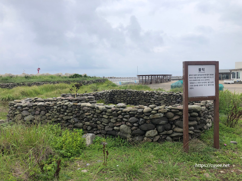 포구 바로 옆에는 제주만의 문화를 살짝 엿볼 수 있는 시설이 두 개 있다. '불턱'과 '돈물깍'. 불턱은 해녀들이 물질을 하면서 옷을 갈아입거나 불을 쬐며 쉬는 곳을 말한다. 지금은 많이 사라진 제주만의 문화재여서 귀한 장소다.