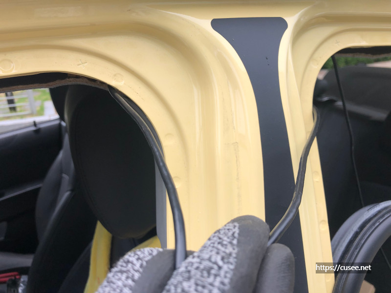 일단 고무관까지 끌어오는 작업이 되어야 작업의 절반을 넘긴 것이다. 이 부분에서 시간이 많이 걸렸는데, 아무리 해도 C-필러와 고무관이 연결된 부위로 이어지지 않아서 찾느라 많은 시간을 보냈다. 결론적으로, 그냥 케이블은 C-필러 아래, 운전석 뒷좌석 타이어 휀더 방향(운전석 뒤쪽 스피커 아래 공간), 트렁크 내장재를 약간 뜯어야 선을 올릴 수 있다.