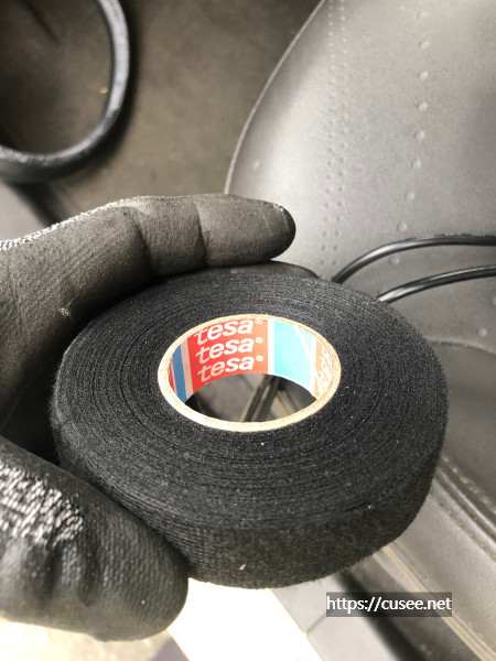 먼저 본체는 룸미러 근처에 설치할 것이어서 부착 위치 선정만 해놓고, 전원선과 후방카메라선을 먼저 작업한다. 전원선과 후방카메라 케이블은 흡음 테이프인 테사(Tesa) 테이프로 감아준다. 테이프는 1 롤에 1천 원 정도 수준으로 인터넷에서 구입할 수 있다. 흡음 테이프로 처리하지 않고 놔두면 차 진동에 따라 소음 발생 가능성이 높다.