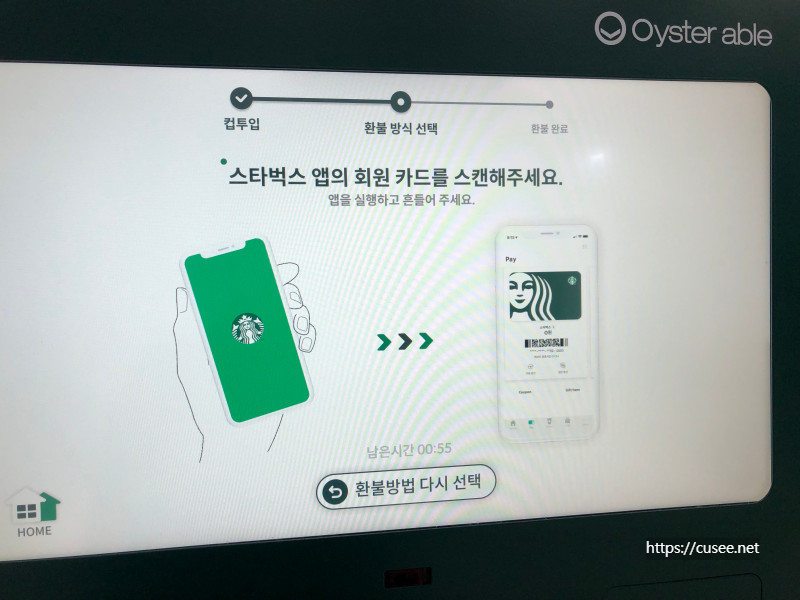 현금은 기계 중간의 오른쪽 현금방출구를 통해 나온다. 그리고 스타벅스 카드 충전금으로 받을 경우는 아래와 같은 안내를 따라 하면 충전된다. 회원 카드를 스캔(반납기 중간 바코드 스캐너)하면 충전된다.
