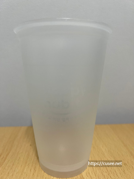 매장 내 사용이 아니면 찬 음료이건 뜨거운 음료이든 상관없이 모두 이 리유저블 컵에 담아줬다. 겉에는 Happy Habbit이라는 글자와 '환경을 위한 행복한 습관'이라는 글자가 새겨져 있다. 일반 찬 음료를 담는 컵보다는 단단한 내구성을 가지고 있으며, 반투명으로, 마치 행사 때 야외에서 마시는 1회용 맥주잔 같은 느낌이다. 실제로 난 이 컵을 집에 가져와서 맥주잔으로 잘 사용하고 있다.