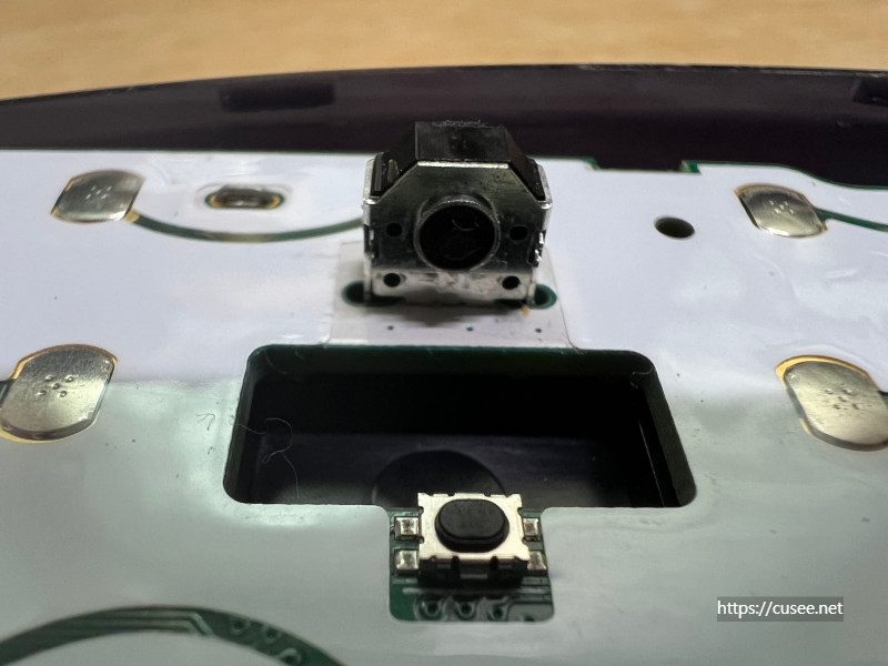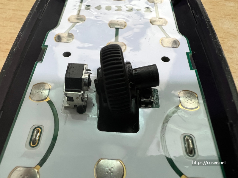 휠을 제거하면 다음과 같이 되어 있다. 휠의 축이 연결되는 부분은 휠을 통해 아래, 위 선택을 할 수 있는 기능이 구현되는 부분이며, 낮게 버튼처럼 되어 있는 부분은 클릭의 역할을 하는 누름 버튼이다.