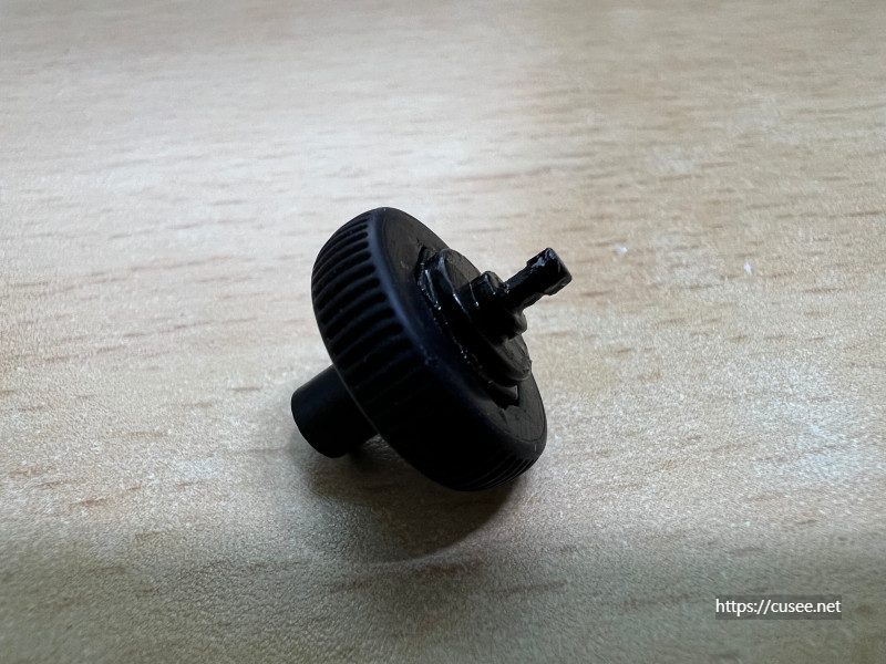 분리된 휠은 작은 플라스틱과 휠을 구성하는 검은 고무덮개로 되어 있다. 사출을 할 때 경도가 적당히 높은 재료를 사용했을 텐데, 중앙에 작은 휠 축이 있었던 부러진 자국이 보인다. 이 부분이 이렇게 약하게 만들어져 있다는 사실에 놀랐다.