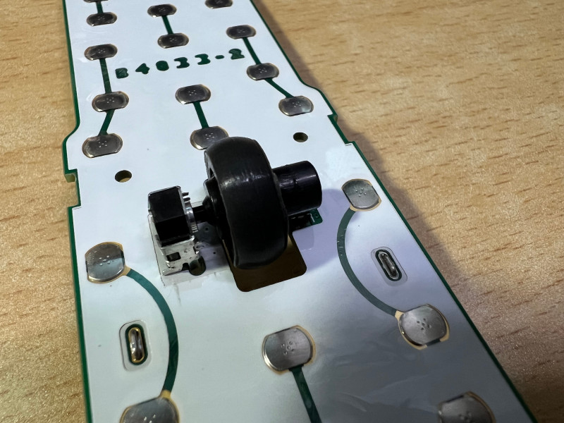 그러나 정상적인 상태라면 휠은 아래처럼 기판에 연결되어 있어야 하는데, 휠에 문제가 있었기 때문에 위와 같은 사진처럼 분리된 것이다. 휠이 기판과 연결되는 부분이 끊어졌다. 그래서 한쪽으로 기울었고, 휠의 회전이 인식이 안되었고, 클릭도 되지 않았다. 클릭은 휠의 다른 축 부분이 눌려지면서 그 아래 기판의 버튼을 누르게 되는 원리다.