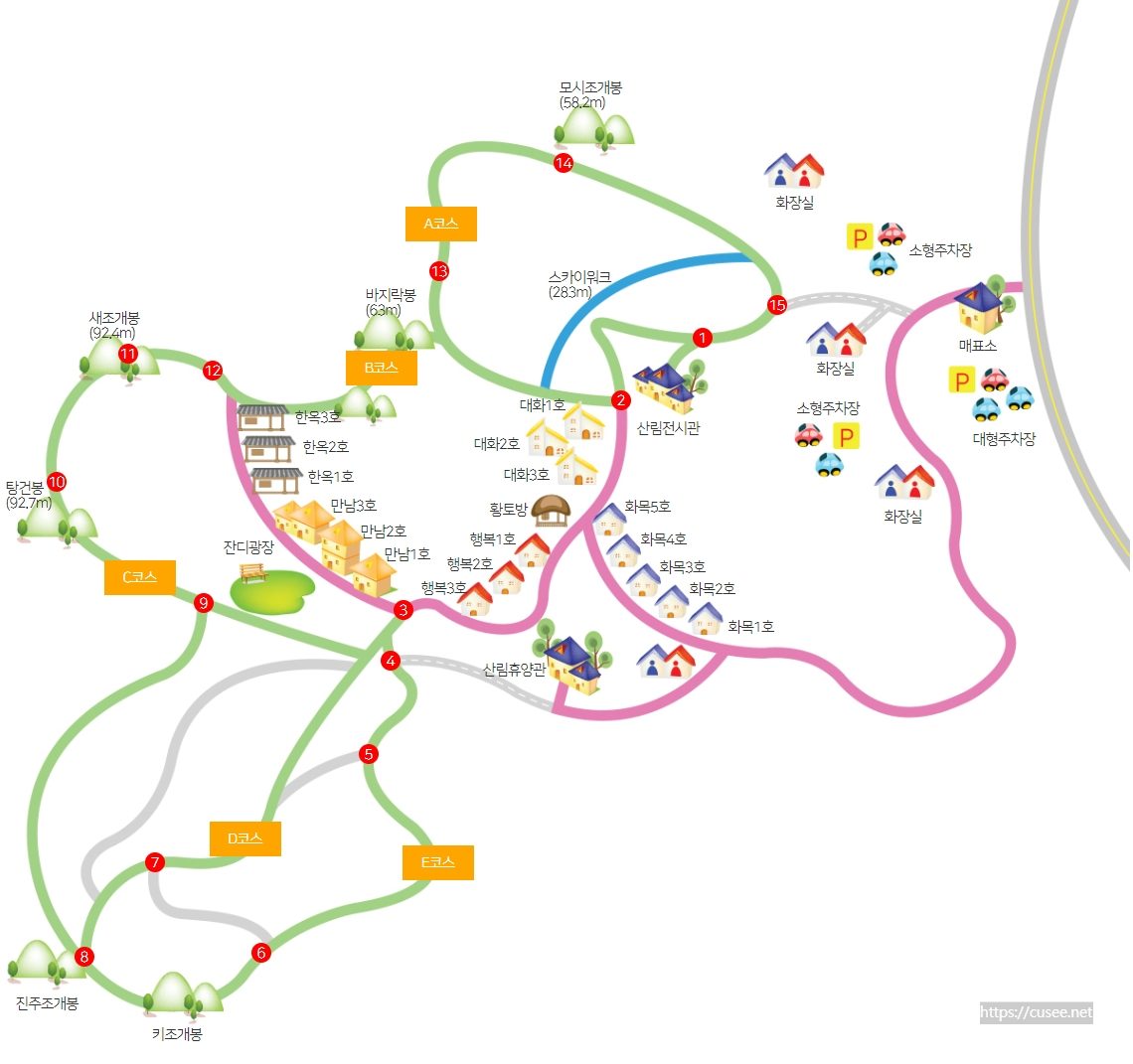 코스별로 봉우리가 있는데 그렇게 높지 않아서 가볍게 트래킹이 가능한 것도 이곳 휴양림의 장점이다. 최소 15분에서 1시간 코스까지 5개 산책코스가 있으니 맑은 공기 마시며 걸어보자. 그런데 이곳만 둘러 나왔다면, 주차비 아까운 거다. 바로 주차장 입구의 지하통로로 반대편 수목원으로 가보자. 위 그림의 매표소 위 소형주차장에서 도로 건너편 방향으로 길이 나있다.