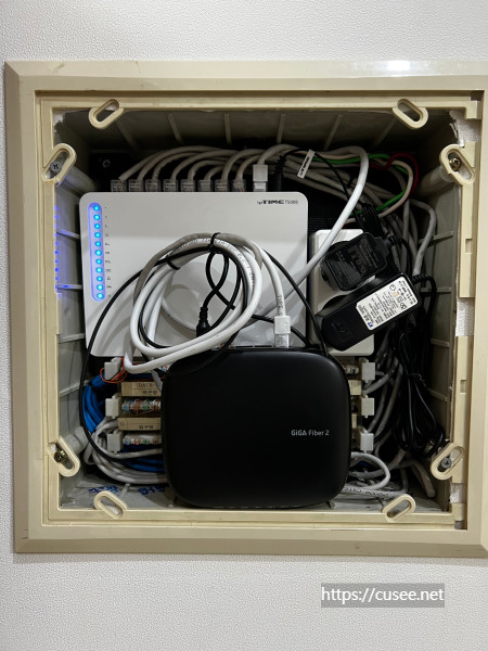 단자함의 파란색 케이블은 네트워크, 회색선은 전화선 용도지만, 지금은 유선전화를 사용하지 않아 두 회선 모두 인터넷 회선으로만 사용하고 있다. 각 포트마다 파란색, 회색선 CAT5.E (Giga 지원)이 연결되어 있다.