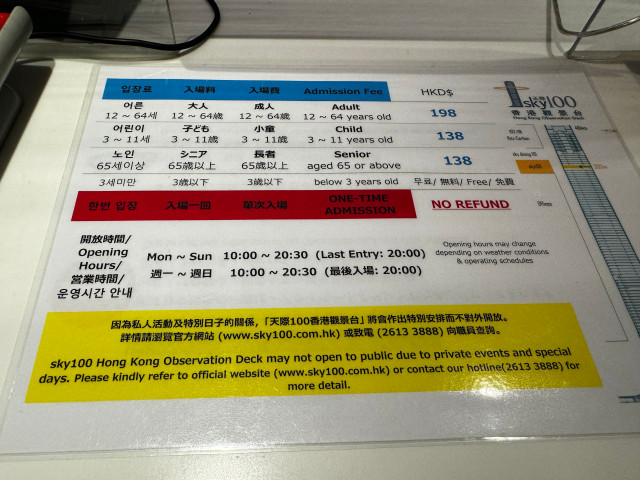 유명 관광지답게 한글로도 안내되어 있다. 현장 티켓발매는 성인 1인 HKD198로 한화 약 33,000원 정도다. 온라인으로 예매할 경우 10% 할인된 HKD178 정도 된다. 만일 클룩으로 예약하면 성인 1인 날짜미지정으로 25,700원이다. 아무래도 클룩 예약이 싼 편이다. 20시 입장마감.