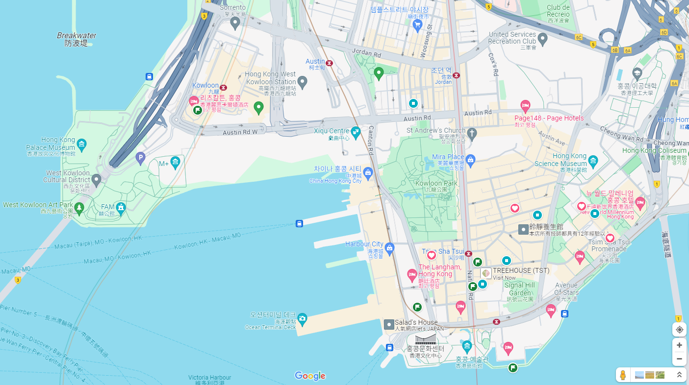 2월 3일 토요일 홍콩의 날씨는 흐림이었다. 이왕이면 맑은 날이었으면 좋았겠지만, 홍콩섬과 바다가 안 보일 정도는 아니었으니 다행이라 생각했다. 호텔에서 Sky100이 있는 ICC(International Commerce Centre, 홍콩국제상업센터)까지는 걸어갔다. 침사추이 중심부를 지나 구룡공원을 끼고 걸어가니 약 2.6km. 많은 인파 속에서 신호등을 건너고 지하도를 거쳐 건너갈 때는 Citymapper 길 찾기를 통해 갔다. 침사추이 동쪽구, 구룡공원, 오스틴역 지나면 바로 만나는 높은 빌딩이 ICC다.