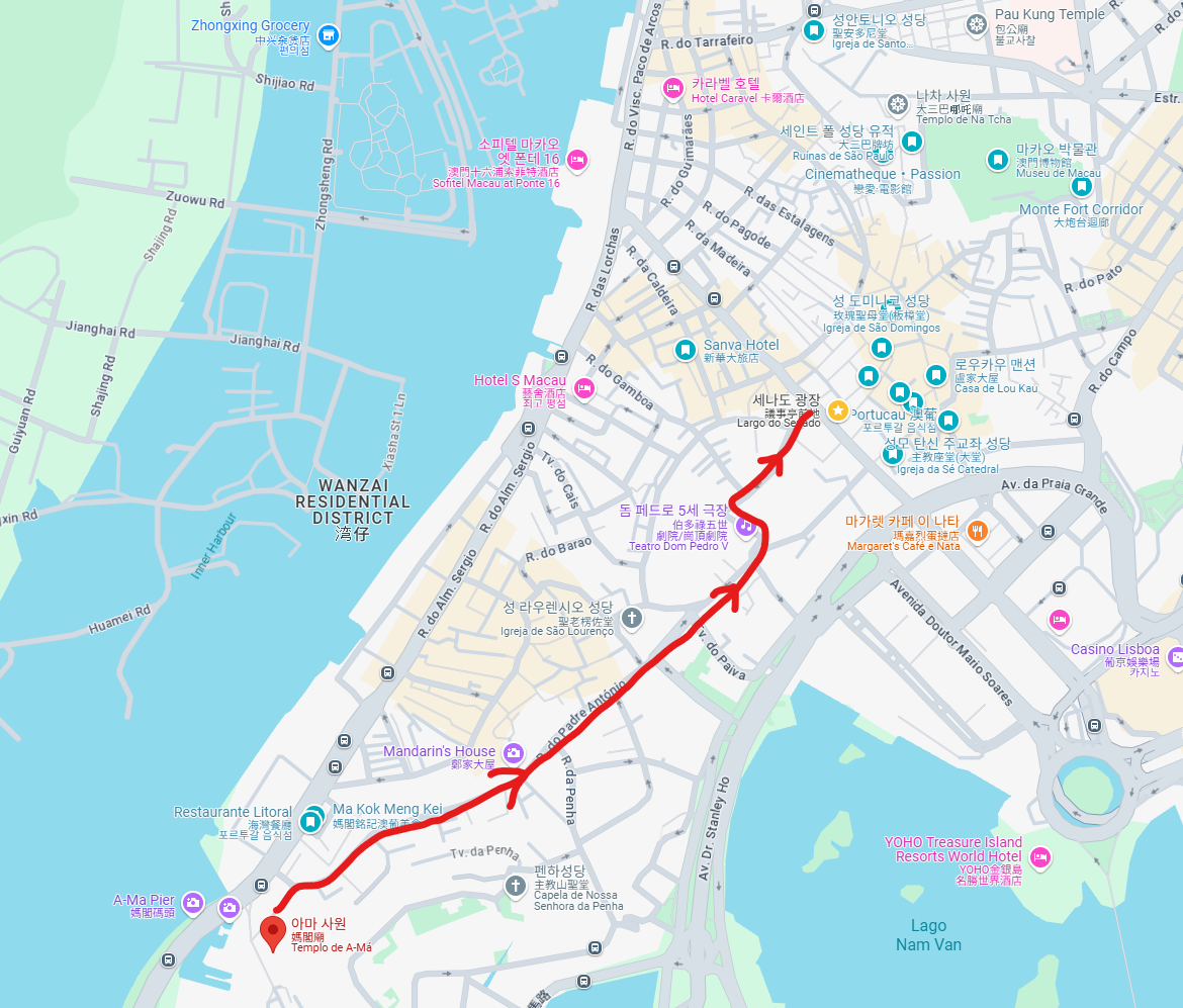 전 일정은 아마사원에서 시작하여 세나도광장까지의 주요 명소를 돌아보는 코스를 짰다. 지도에서 보이는 거리와 실제 걸어보면 마카오라는 곳이 작은 지역이라는 것을 알 수 있다. 아마사원에서 세나도광장까지 직선거리로는 1.2km 밖에 되지 않으며, 골목길을 걸어도 1.5km 정도의 거리니 걷는 걸 좋아하는 사람이라면 이리저리 구경하고 다녀도 2시간이면 충분한 이동거리다.