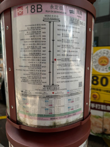 다음 목적지가 마카오타워여서, 정거장을 출발지로 하여 버스를 검색하니 18B가 비교적 가깝게 타워근처에 내리는 것을 확인하고 버스를 탔다. 도로명은 Av. de Sidonio Pais. 방향은 남쪽. 정거장명은 Pavilhão Polidesportivo Tap Seac(塔石體育館, 탑섹체육관).