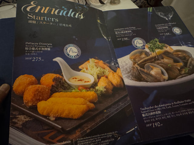 아내가 마카오를 꼭 가보자고 한 이유 중 하나는 마카오 특유의 매캐니즈(포르투갈과 중국음식의 퓨전) 음식을 맛보기 위해서였다. 첫 날은 친숙한 음식을 먹기 위해 북방관을 갔다면, 둘째날은 모험의 날로 매캐니즈를 먹어보려 했다. 그래서 가까운 타이파에서 고르기로 했고, 구글 평점이 높은 곳을 찾아갔다. 그래서 방문한 곳은 '알마'라는 포르투갈 레스토랑이었다.